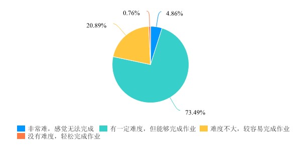 在作业难度方面。95.14%的同学认为目前学习模式下能够完成作业。其中,73.49%的学生认为作业有一定难度,但能够完成作业。调研显示,4.86%的学生认为作业难度非常大,感觉无法完成,需要重点关注。