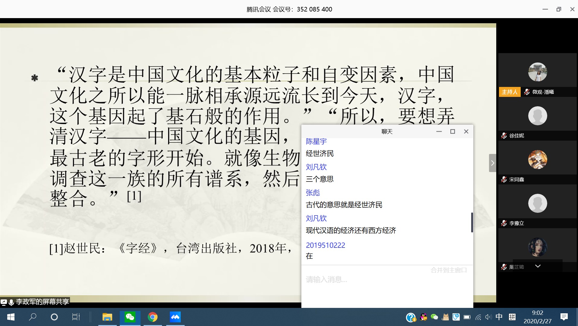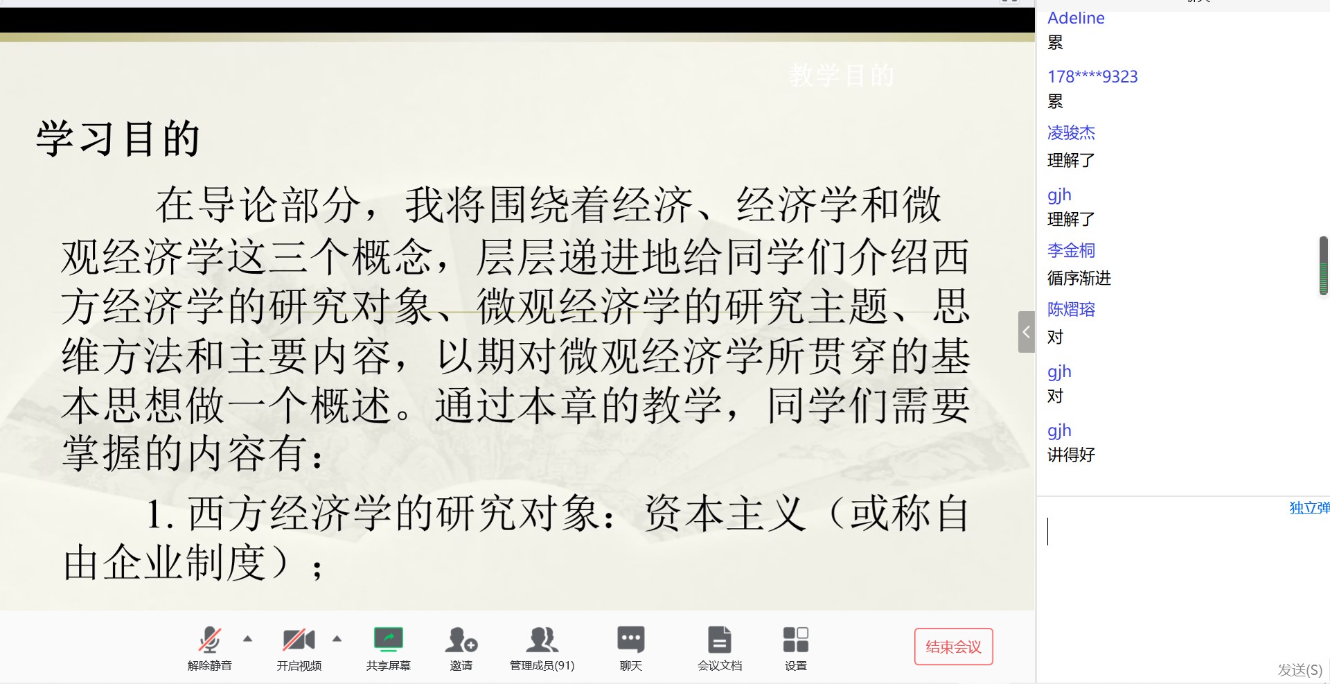 第一次联合教学选定在227日(周四),上午的1-3节课是李政军教授与潘曦老师为19级经济学2班的同学进行授课,下午的6-8节课是李政军教授与刘春兰老师为19级金融7班和8班的同学授课,采取腾讯会议在线直播方式讲解本课程“导论”部分知识。为更好地监测学生对《微观经济学在线课程》学习效果,李政军教授首先抽取了部分同学来回答本部分在线视频讲解的重要知识点,并根据学生回答情况,从中国汉字发展文化、经济一词发展的由来,并结合案例详细地为同学们讲解了本课程导论部分的“经济”、“经济学”、“微观经济学”三个重要概念,李政军教授以丰厚理论积淀、循序渐进的讲解方法,为同学们搭建起《微观经济学》的学习框架,使得在线教学学生参与度高(全勤)、课程活跃度高(见图2、图3),在讲解过程中纷纷获得学生好评(图4),在本课程内容讲解结束以后,潘曦老师与刘春兰老师分别就自己的授课班级本学期的授课要求、考核要求给大家作了说明。