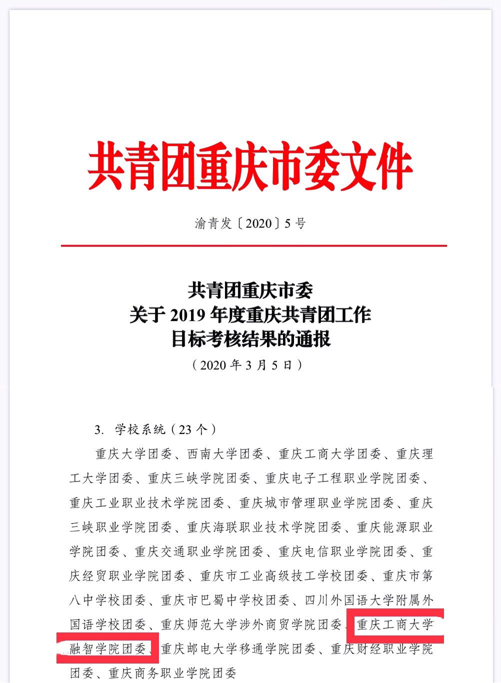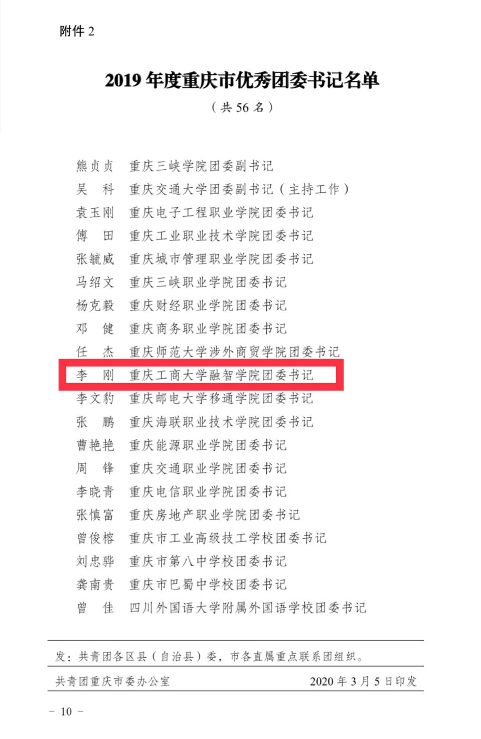 近日,共青团重庆市委下发了《关于2019年度共青团工作目标考核结果的通报》(渝青发〔20205号),我校在2019年度重庆市共青团工作目标考核中成绩优异,考核结果为“特等团组织”,这也是我校继2018年后再次荣获目标考核“特等奖”。我校团委书记李刚荣获“2019年度重庆市优秀团委书记”荣誉称号。