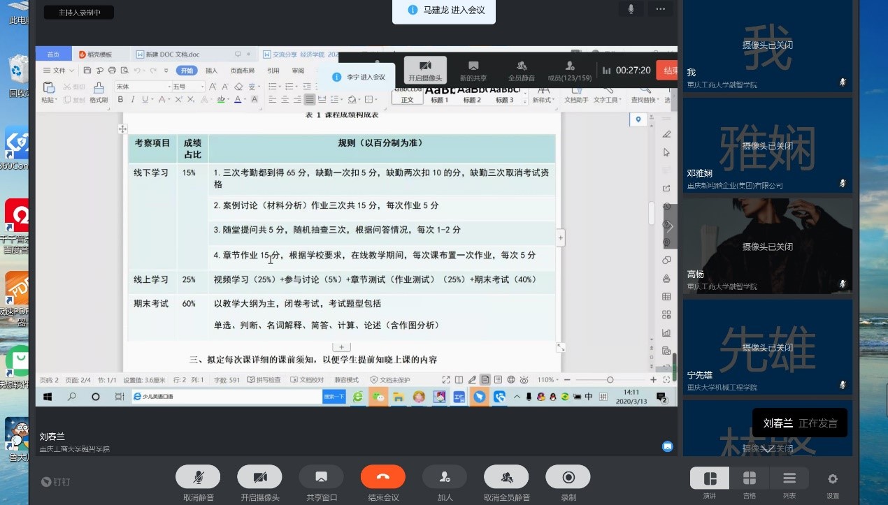二是勇于创新,做好线上教学的运行质量。教师们不断学习教学工具应用技巧,创新教学方式,如刘春兰老师的多渠道同时发送课程学习资料,让学生查阅更加方便,确保每一个学生都能顺利接收,又如康建功老师利用电子笔、白板、思维导图等数字工具辅助教学。西方经济学教学团队着手改革平时考核成绩构成,将得分项目更加细化、具体化,以适应线上教学的要求,提高学生参与学习的积极性、主动性。改变教学方法,如胡文静老师在已经拥有丰富的课程资源、课程讲义、习题库、案例库的基础上,加速从传统教授方法向SPOC教学方法转变。具体的还有拟定详细的课前须知和课后要求发送给学生 ,让学生知道上课的内容、目标、要求、工具,更好的预习并参与到教学过程中,通过课后的作业、阅读材料、案例拓展让学生学会知识点如何应用、应用到什么地方。