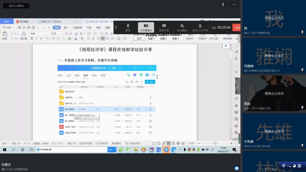 为更好地落实教育部和重庆市教委关于“停课不停教、停课不停学”的指示,在校领导的指导下,2020年3月13日下午,教务处教师发展中心组织全校教师开展了“线上教学交流分享会”。本次会议采用钉钉群视频会议的方式进行,共147名教师全程参加。刘春兰等10位老师分享了自身及教学团队的线上教学经验,各参会教师认真聆听,努力总结汲取经验以进一步提升线上教学效果,保障学校人才培养质量。