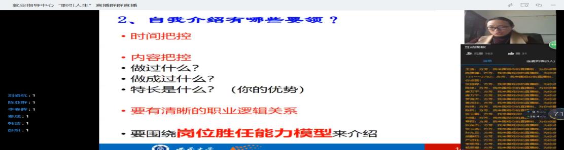 第四场讲座是由西南大学方凤玲老师主讲的“求职准备——远程面试123”,方凤玲老师告诉同学们远程面试要做到万无一失的面试准备、注意人职匹配的自我介绍、掌握讲好面试故事的三大手段。尤其在自我介绍和讲好故事环节中进行了详细的指导,通过“第一次”、“变化”、“至暗时刻”、“闪光时刻”、“照片”、“礼物”找素材,通过“风和日丽”、“晴天霹雳”、“洪荒之力”、“晴空万里”套模式,讲授生动形象,教授的面试技巧实用有效。