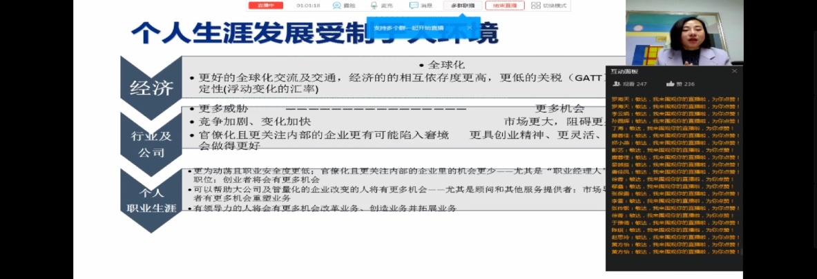 此次开展的就业指导系列直播讲座,帮助每位参训的同学了解疫情防控时期就业新形势新政策新趋势,学会自我调整就业心理状态,积极掌握面试应对技巧和职场沟通交流方法,一定程度上强化了同学们的求职技能,进一步增强了同学们的信心。在求职的路上,也许很艰辛,若调整心态,不断学习,充分准备,增强自我职业素养,艰辛的道路也将满是迷人的鲜花和动人的风景。
