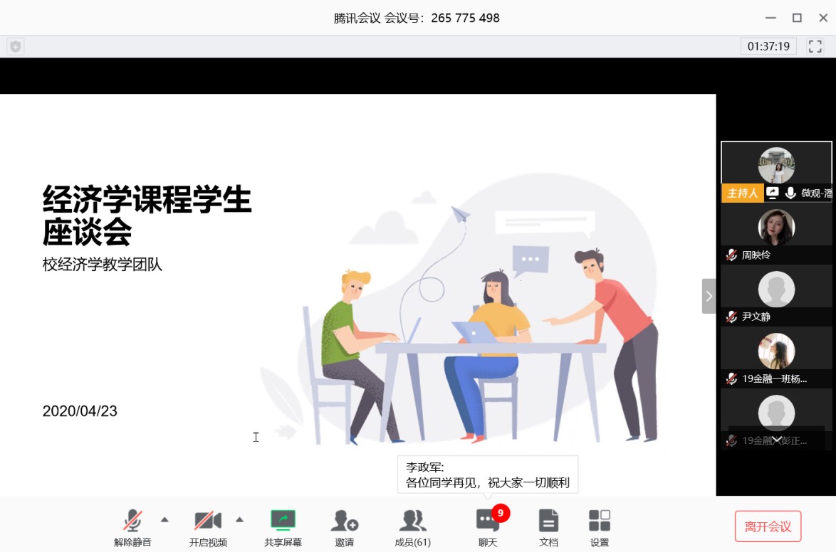 2020423日中午1230分,校经济学教学团队在线上召开了本学期期中教研活动的首场活动——期中学生座谈会。团队首席教授李政军、团队队长潘曦、课程组长李星林、团队成员刘春兰、周映伶,以及微观经济学、宏观经济学和经济学原理的51个班级的60余名学生代表参加了此次座谈会。座谈会由团队队长潘曦主持。