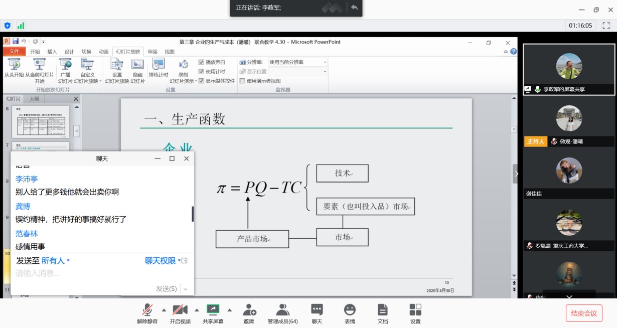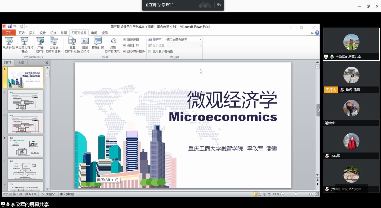 2020年4月30日,我校经济学教学团队面向全校教师开放《微观经济学》联合教学的在线课堂。教学活动共两场,分别是上午李政军教授与潘曦老师以“翻转课堂”形式展开的联合教学,及下午李政军教授与刘春兰老师以传统教学方式展开的联合教学。参与的老师有团队14位成员、部分校内老师及学校督导专家。
