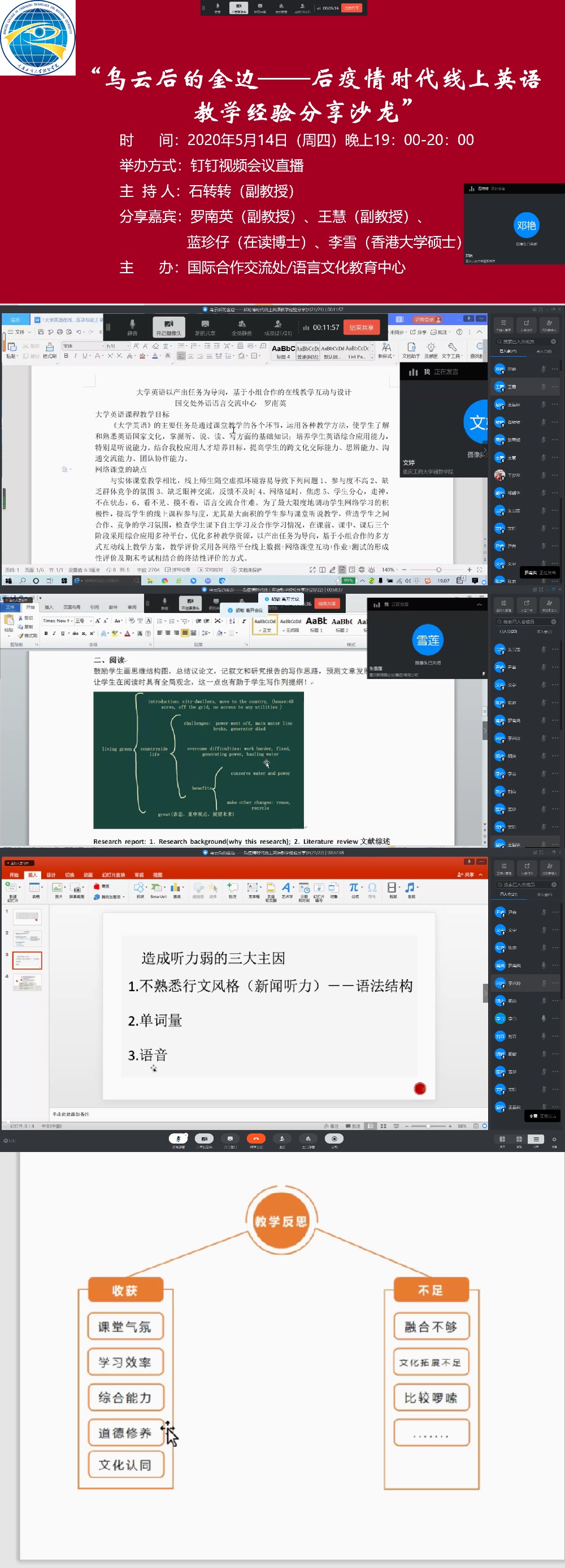 2020514日周四晚上1900-2000,我校成功举办2020年国际文化交流月系列活动之乌云后的金边——后疫情时代线上英语教学经验分享沙龙。此次沙龙借助钉钉平台举行,由国际合作交流处处长兼语言文化教育中心主任石转转副教授主持。