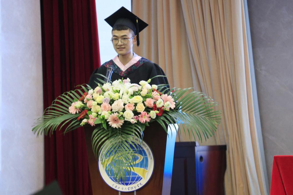 “海阔凭鱼跃,天高任鸟飞”毕业生代表郑博文同学这样激昂的讲到。他还谈到每位毕业生都应不忘来路,铭记恩师,感恩母校,但更要志存高远,既然选择了远方,即使前路艰险,也要风雨兼程。