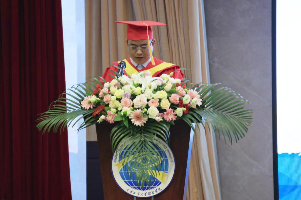教师代表,信息工程学院李辉表示,看到学生们学有所成,顺利毕业,身为人师感到十分欣慰和满足。每年的毕业季都意味着又一次分离,但离别不是愁,是同学们崭新的征程。希望学生们坚持学习,认真工作,成就辉煌的未来。