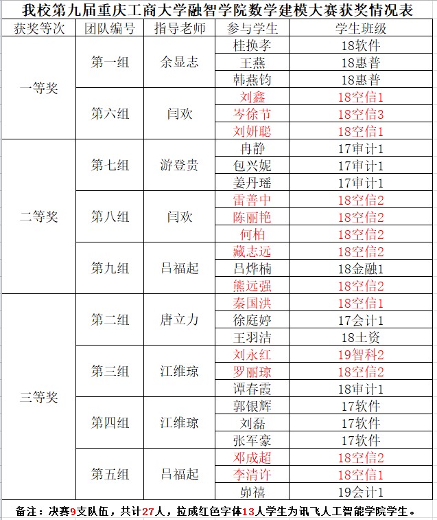 在第九届重庆工商大学融智学院数学建模大赛中,共9支队伍分别获得一、二、三等奖,其中以讯飞人工智能学院学生为主的团队占4支队伍;9支队伍共计27人,其中讯飞人工智能学院占13人。