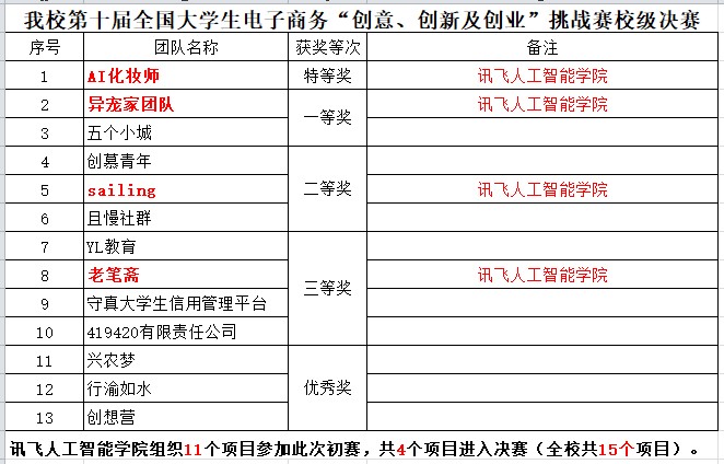 在第十届全国大学生电子商务“创意、创新及创业”挑战赛校级决赛中,全校15支队伍进入决赛,其中讯飞人工智能学院4个项目入围,评出获奖项目13个,分别是特等奖1个、一等奖2个、二等奖3个、三等奖4个、优秀奖3个,其中讯飞人工智能学院4个项目均获奖(分别获得特等奖、一等奖、二等奖、三等奖)。