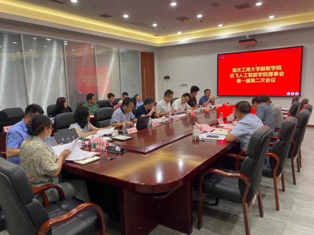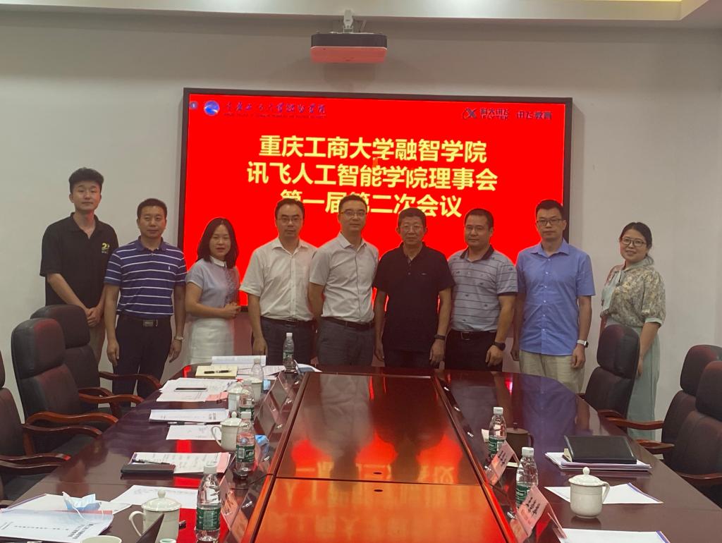 2020年7月3日,重庆工商大学融智学院讯飞人工智能学院理事会第一届第二次会议在行政办公楼2303会议室召开。会议由理事长沈民主持,新鸥鹏教育集团专家委员会主任王崇举、重庆工商大学融智学院党委书记张毅、重庆工商大学融智学院常务副校长吴华安作为特邀嘉宾出席会议,理事会成员杨洋、周启刚、周雄、王胜峰、王晓云、陈吉勇、田荣阳、屈芳青等全部到会,讯飞人工智能学院原芳、张成林、唐立力、艾军勇、李冰彦、胡静等列席会议。