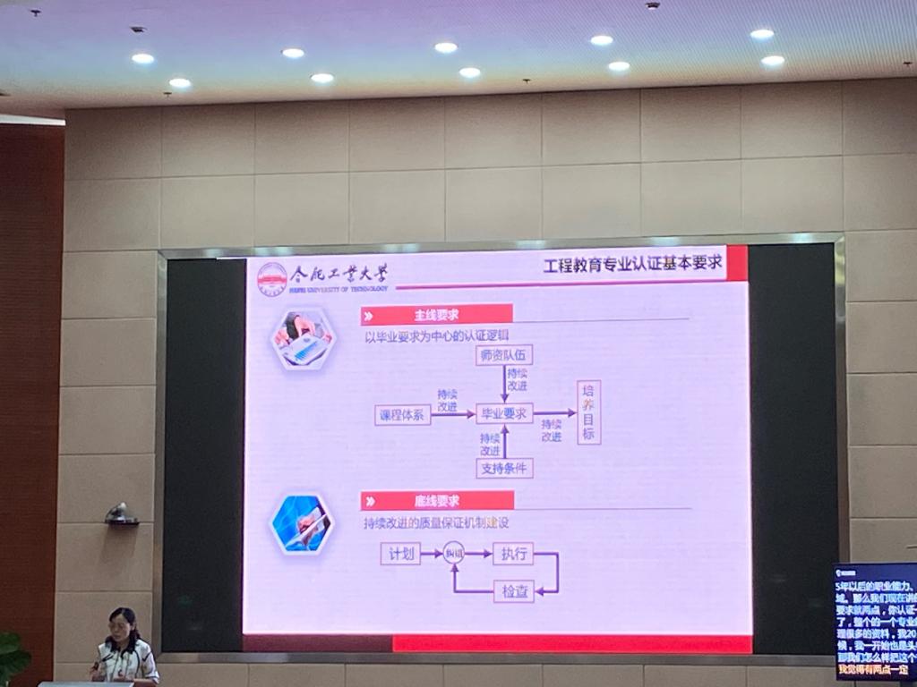 随后由合肥工业大学的黄志云教授和安徽工业大学的郑啸教授分别分享了在实际工程认证的申报中实施的指南和遇到的问题。黄志云教授提出工程认证就是以学生为中心,以产出为导向,持续改进的一种机制。以五年后的培养目标,指导课程体系、师资队伍、支持条件等方面的建设,底线的要求就是持续改进。郑啸教授就毕业总目标的分割,如何对应各个课题以及具体执行方案和现场考察措施等发面做了详细报告。