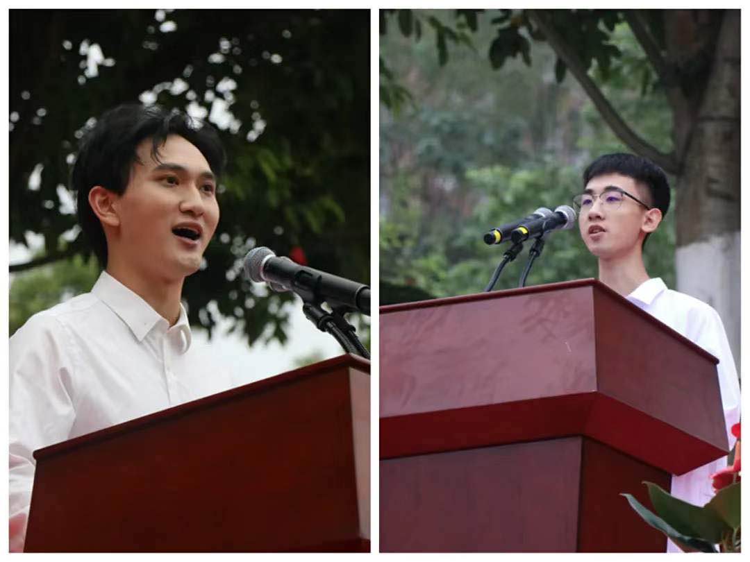随后,老生代表经济学院2019级贸经班的蒋成绪和新生代表金融学院2020级CFA班的李丙驰同学代表发言。他们感谢学校细心体贴的安排、老师无微不至的关心和学长学姐热情周到的帮助。他们表示将在以后的学习生活中要不断丰富自己、突破自己,踏踏实实走好每一步,认认真真做好每件事,让青春不留遗憾。他们号召所有的新同学都要把个人理想追求融入国家和民族事业之中,勇做走在时代前列的奋斗者、奉献者、追梦者,不辜负时代,成为有理想有担当的新时代融智人。