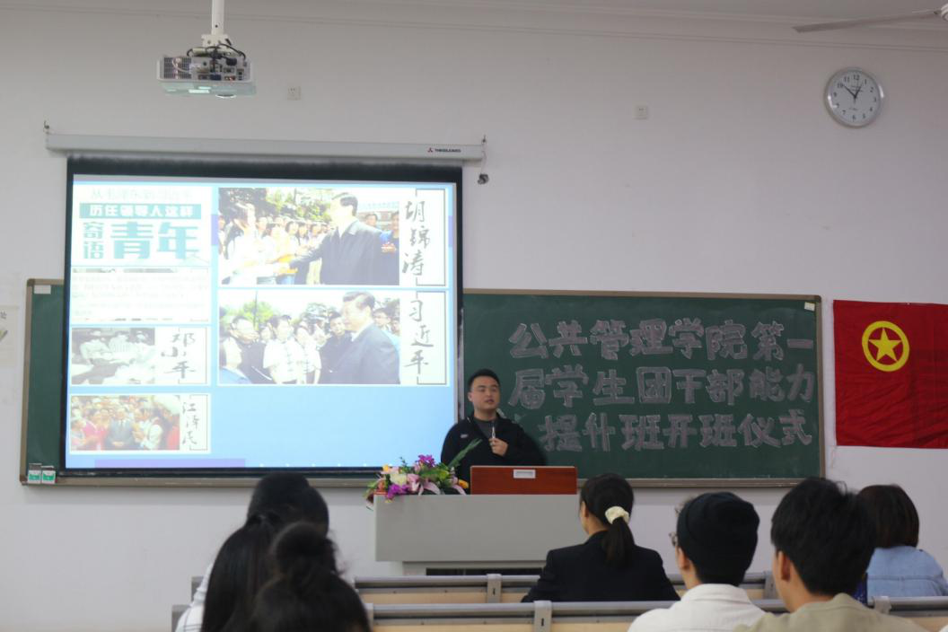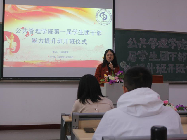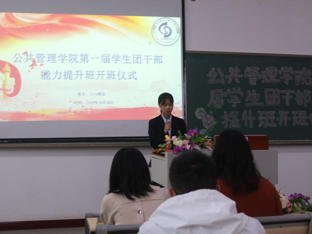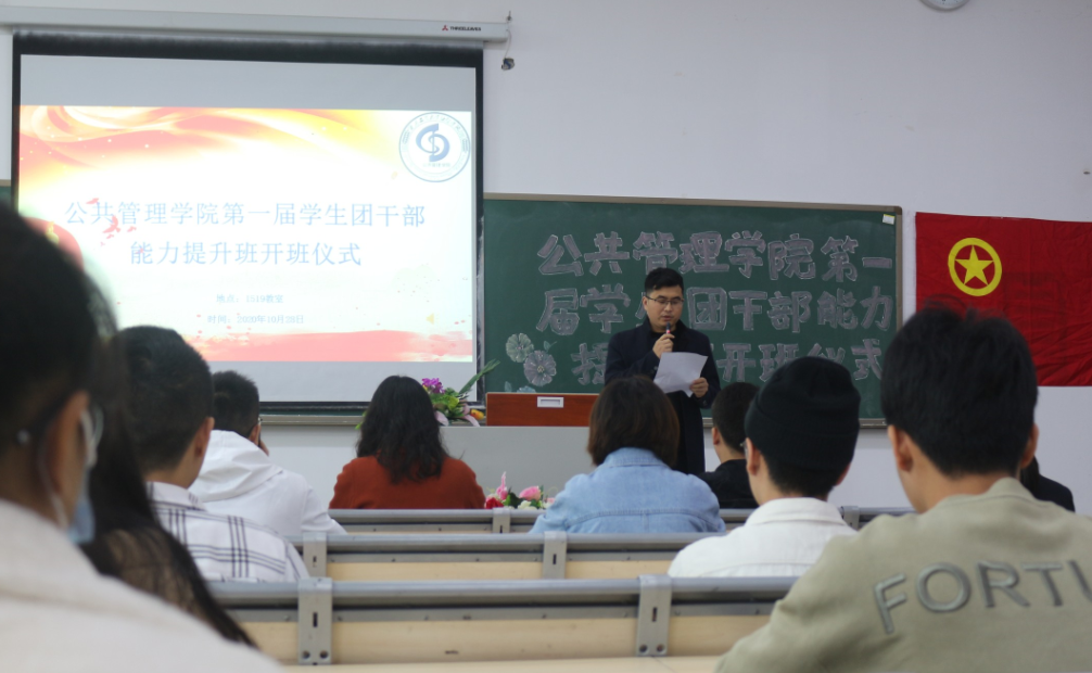 为深入学习贯彻全国学联二十七大会议精神,提升学生团干部能力,加强基层团组织建设, 2020年10月28日中午,我校公共管理学院第一届学生团干部能力提升班在教学楼1519教室成功举行,学院团总支、学生会全体学生干部及各班团支书、班长参加了此次培训。出席本次开班仪式的嘉宾有马克思主义学院常晓薇院长、公共管理学院党总支李辉副书记,学团办主任范雪林老师、专职辅导员徐瑞老师。