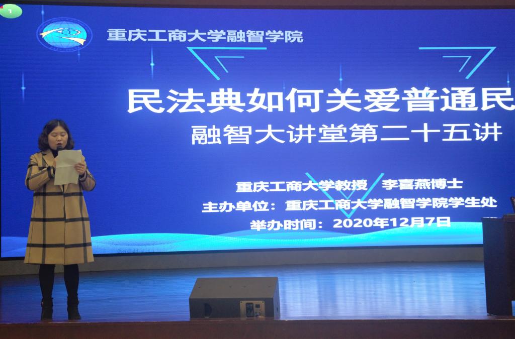 12月7日,由学生处主办的“融智大讲堂”第二十五讲——“民法典如何关爱普通民众”专题讲座在重庆工商大学融智学院学术报告厅顺利举行。本次讲座由重庆工商大学教授李喜燕主讲,学生处处长唐川川主持,共有300余名师生参加了本次讲座。