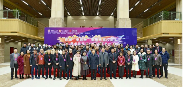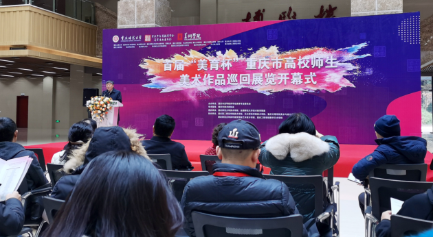 2020年12月5日,由重庆市高等教育学会、重庆市美术家协会指导,由重庆市美育专委会主办,重庆师范大学美术学院承办的“美育杯”重庆市高校美术作品巡回展览在重庆师范大学开幕。我校新媒体艺术学院高尚、殷骆骏楠老师受邀参加首届“美育杯”重庆市高校美术作品巡回展览开幕式。