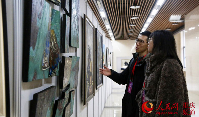 | 我校新媒体艺术学院高尚、殷骆骏楠老师观展。图源:人民网重庆频道 |
