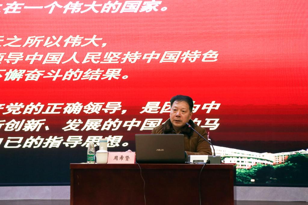 周希贤教授以“中国共产党的指导思想”为主题,围绕中国特色社会主义、中国特色社会主义理论体系与马克思列宁主义毛泽东思想的关系,邓小平理论、“三个代表”重要思想与科学发展观核心内容,习近平新时代中国特色社会主义思想丰富内涵三个方面,讲解了党的指导思想。