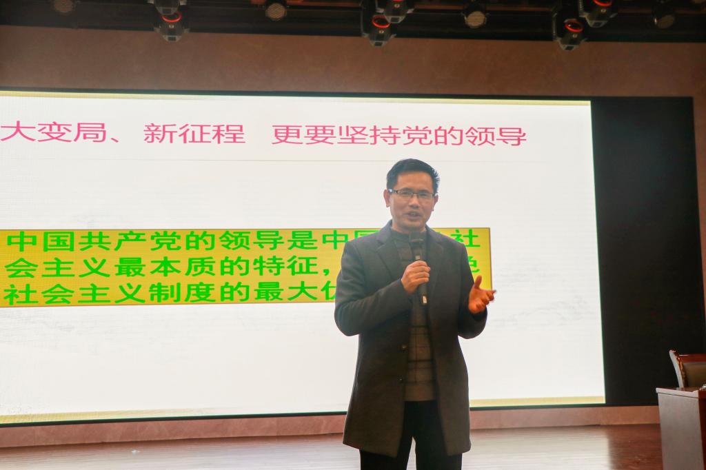 李果副院长以“大变局、新征程,更要坚持党的领导”为主题,围绕在中国共产党的领导下,中国发生翻天覆地的变化、世界新格局、国际大环境三个方面,讲解了中国共产党带领人民走上了正确的革命道路、开辟中国特色社会主义道路、“五位一体”总体布局和 “四个全面”战略布局,推动党和国家事业发生历史性变革。