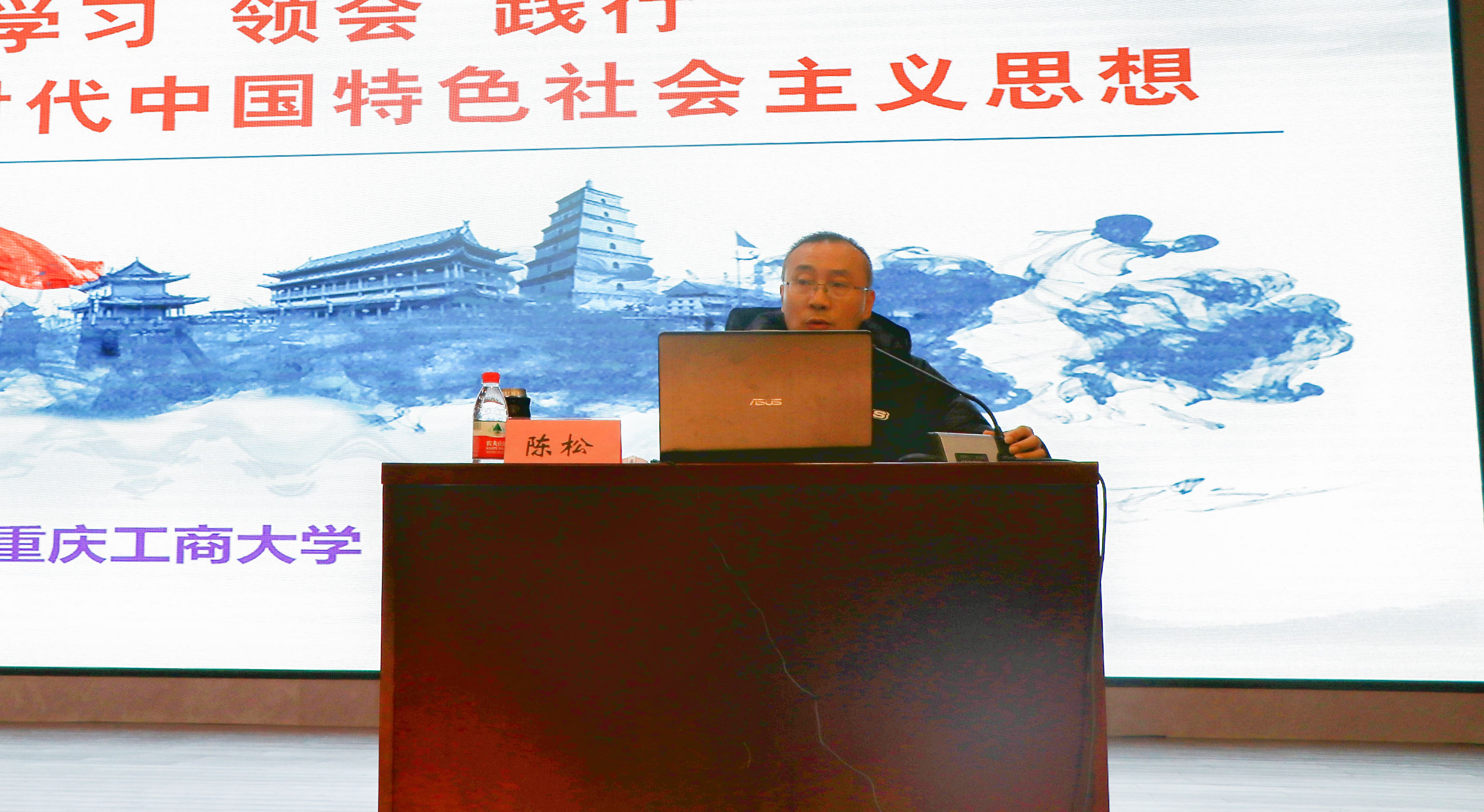 陈松教授以“学习、领会、践行习近平新时代特色社会主义思想”为主题,围绕初心与使命、新时代、社会主义矛盾四个方面,讲解了“为中国人民谋幸福,为中华民族谋复兴”的要义,同时,重点阐述了习近平新时代特色社会主义思想的丰富内涵。