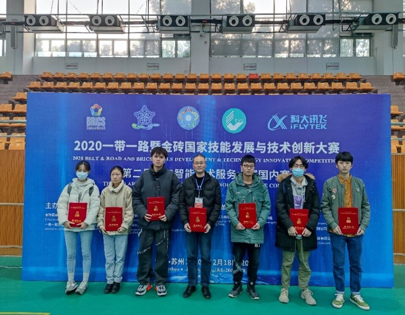 20201220日,2020一带一路暨金砖国家技能发展与技术创新大赛之第二届人工智能技术服务大赛国内赛闭幕式在苏州市职业大学举行。我校讯飞人工智能学院团队由专职老师姜抗带领18级空信专业6名学生(陈宏、岑徐节、陈香、吴泽杰、唐小林、李菲菲)组成两支队伍参加本次大赛,并分别斩获二等奖和优秀奖。