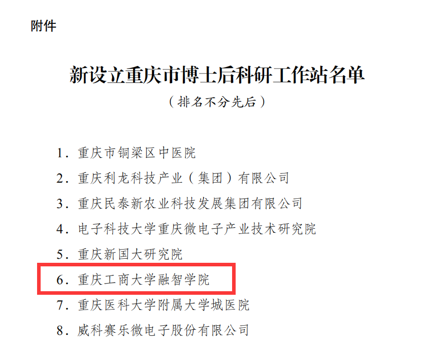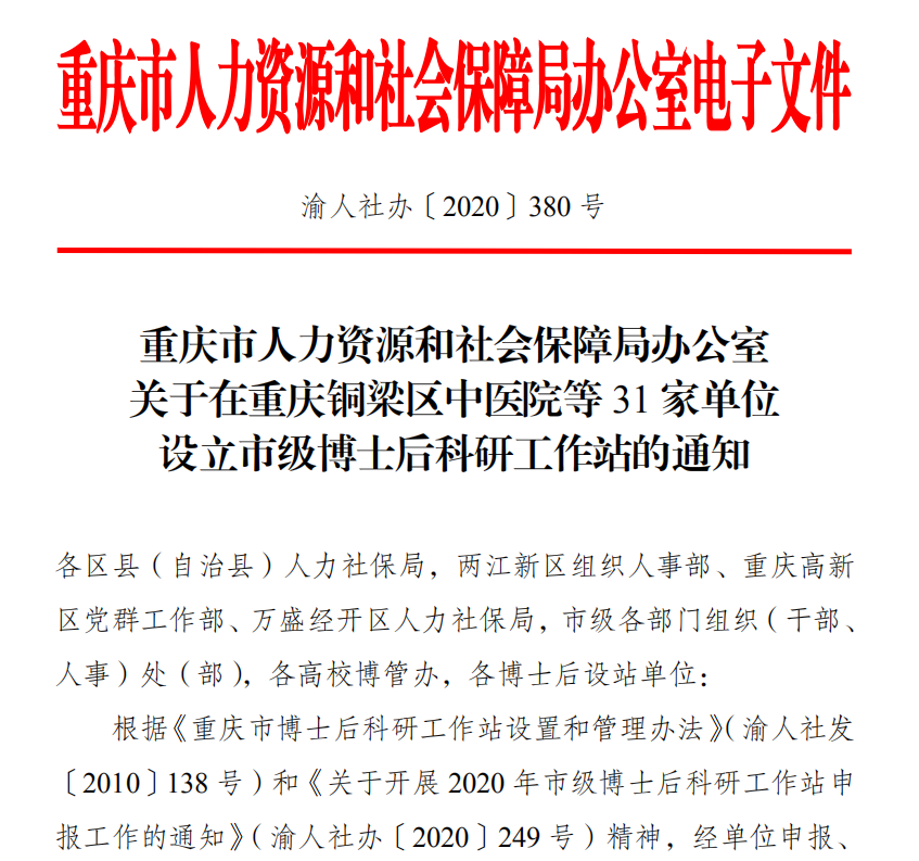 近日,重庆市人力资源和社会保障局办公室印发了《重庆市人力资源和社会保障局办公室关于在重庆铜梁区中医院等31家单位设立市级博士后科研工作站的通知》(渝人社办〔2020〕380号),我校成功获批设立市级博士后科研工作站,成为重庆市唯一获批市级博士后科研工作站的民办高校。
