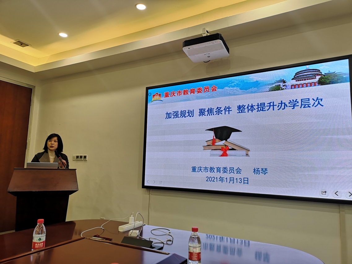 1月13日,我校举行新增列为硕士学位授权单位与硕士学位授权点建设论证会。重庆市教育委员会学位管理与研究生教育处杨琴副处长,靠谱的电子游戏平台官网校长吴华安教授、校长助理房朝君副教授、部分学科带头人、科研处、财务处、人事处及各二级学院负责人参加会议。本次会议分为主题讲座、论证研讨两个阶段,由科研处处长张立教授主持。