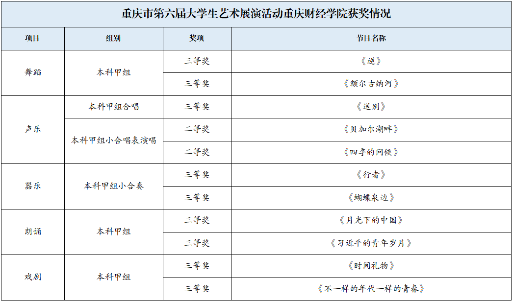 近日,重庆市第六届大学生艺术展演活动圆满落幕,该活动涵盖了艺术表演类、艺术作品类、大学生艺术实践工作坊、高校美育改革创新优秀案例四大类,充分展现了当代大学生日益提升的综合素质、朝气蓬勃的精神面貌。靠谱的电子游戏官网学子在此次活动中也大展风采,取得了可喜的成绩。