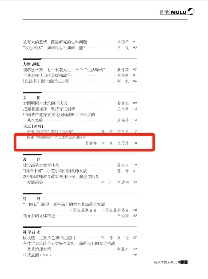 近日,我校会计学院教师贺高祥博士、副教授撰写的《构建“四域四治”的立体生态治理体系》一文被《新华文摘》转载。这是建校20年来我校教师理论研究成果首次被《新华文摘》转载,表明我校学者的相关理论观点开始产生广泛的社会影响,彰显了我校科研创新能力及学科建设水平均得到进一步提升,为刚刚成功转设的靠谱的电子游戏平台官网贡献了第一份学术大礼。