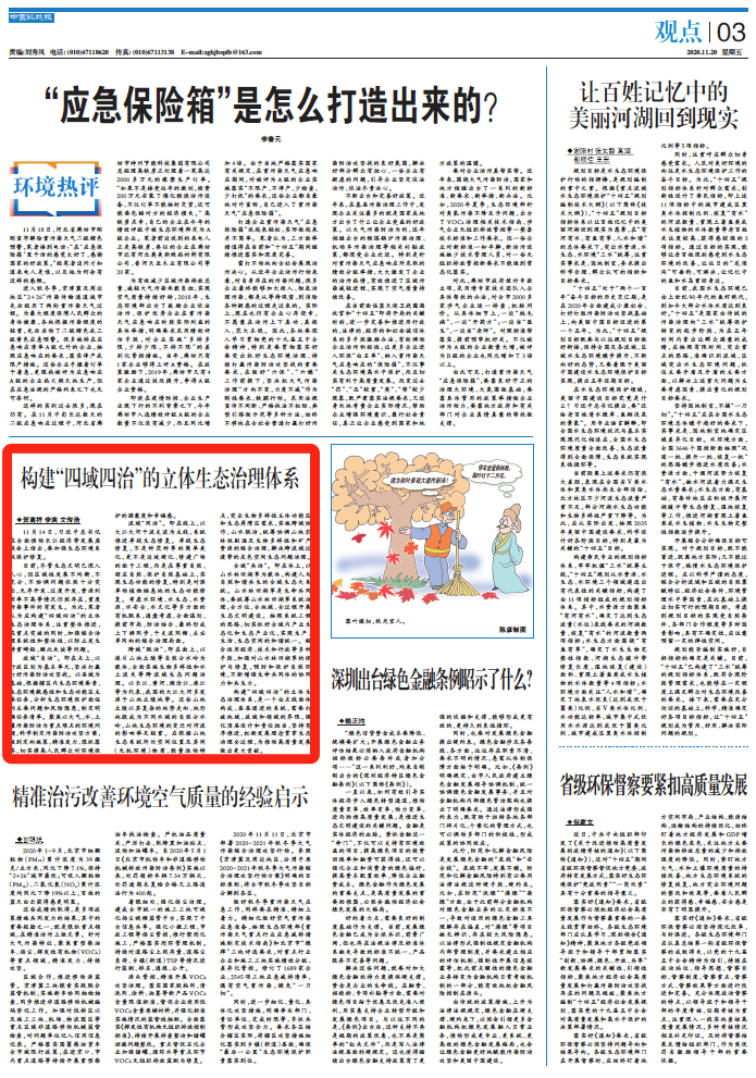 该文于2020年11月20日发表于《中国环境报》第003 版(观点),文章指出我国生态文明建设区域发展不均衡、不充分、不协调等问题依然突出,无序开发、过度开发、资源利用率不高等情况仍然存在,应构建政域“自治”、流域“同治”、跨域“联治”、全域“共治”的立体生态治理体系,打破地域、政域和领域界限,强化顶层设计和责任担当,把新发展理念贯穿生态治理全过程。