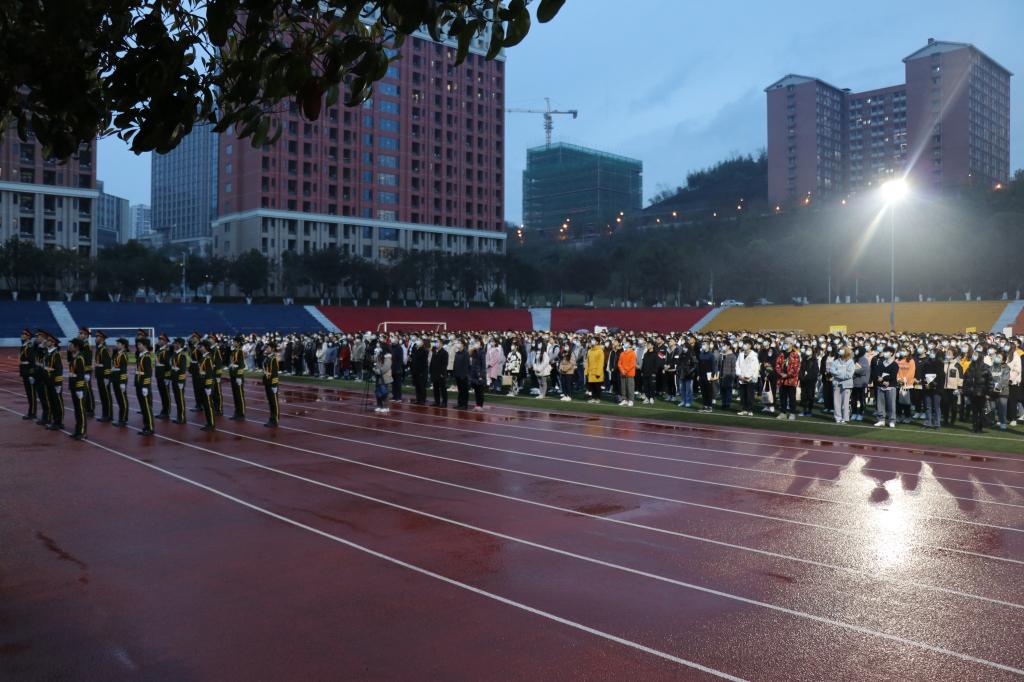 在全体师生的注目礼下,雄姿英发的国旗仪仗队同学护送五星红旗和校旗进场。伴随着庄严的国歌,师生们全体肃立,怀着崇高的敬意注视国旗冉冉升起。