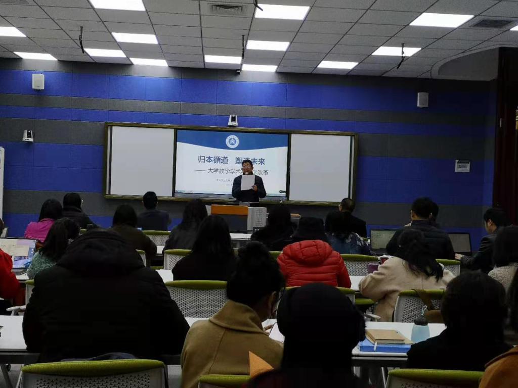 为促进教学改革工作,提升教师教育教学研究与改革能力,进一步提高人才培养质量, 3月5日上午9:30,教师发展中心在教学楼1220(智慧教室)组织了“归本循道•塑造未来——大学教学学术与教学改革”的专题讲座活动。本次讲座特别邀请了重庆交通大学教务处处长杨林教授担任主讲人,由靠谱的电子游戏平台官网副校长沈民主持,教务处处长周雄、组织人事部副部长滕学英,以及各学院院长、骨干教师共68名教师参加了本次讲座。
