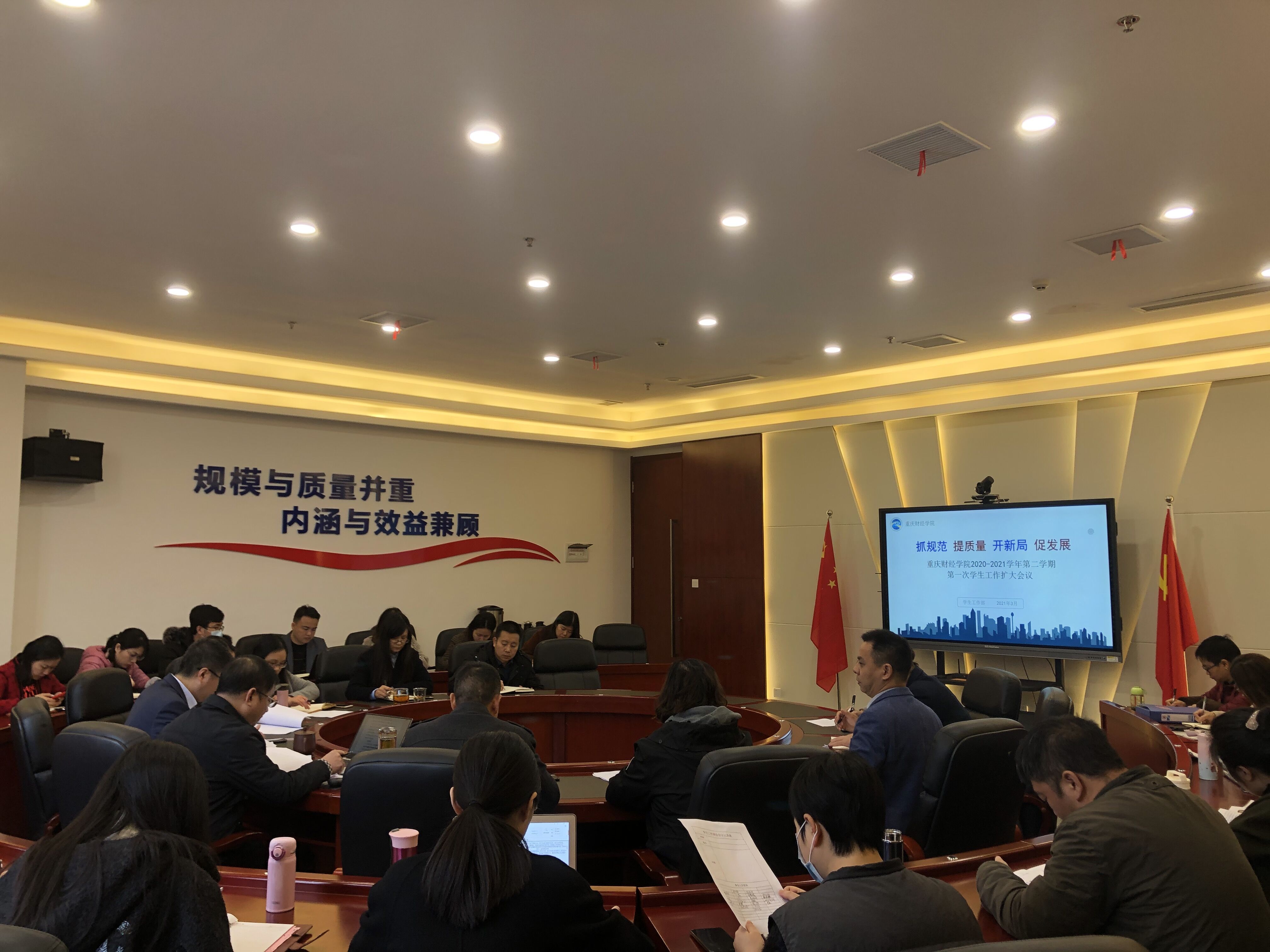 学校党委张毅书记结合当前形势,对新学期学生工作做了四个方面的强调:一是学生工作要以建党100周年为契机,在全校师生中广泛开展党史学习教育活动,加强意识形态教育和阵地管理;二是要加大对特殊学生群体的关注力度,提高毕业生考研率和专升本教育质量,解决学业困难学生的实际问题;三是落实市委、区委的要求,持续做好疫情防控工作,各学院、各部门要进一步提高认识和政治站位,确保校园安全稳定;四是强化工作沟通机制,在教师与辅导员之间,教务处与学生处之间,学院与学校之间提高沟通效率,提升工作质量。