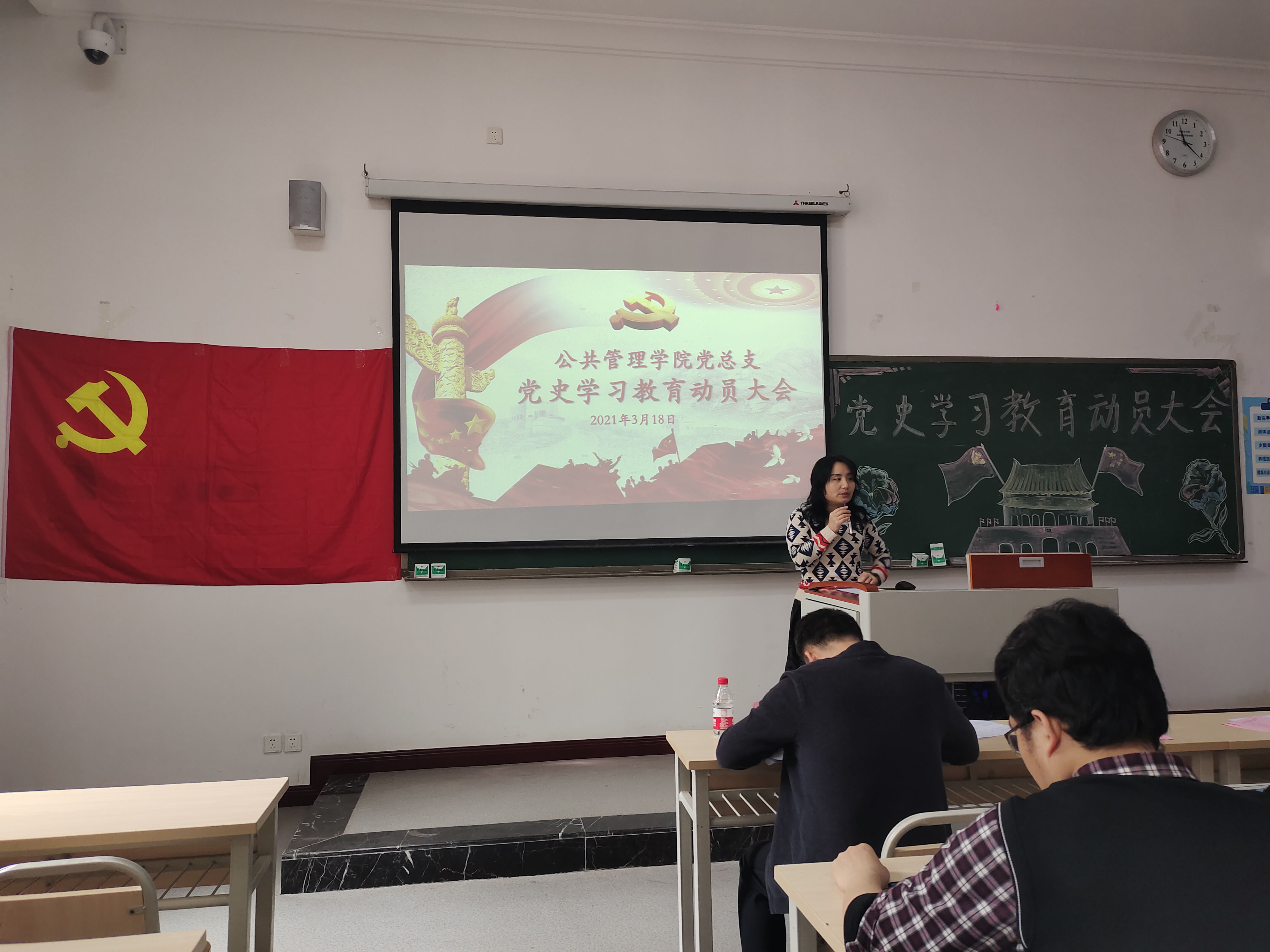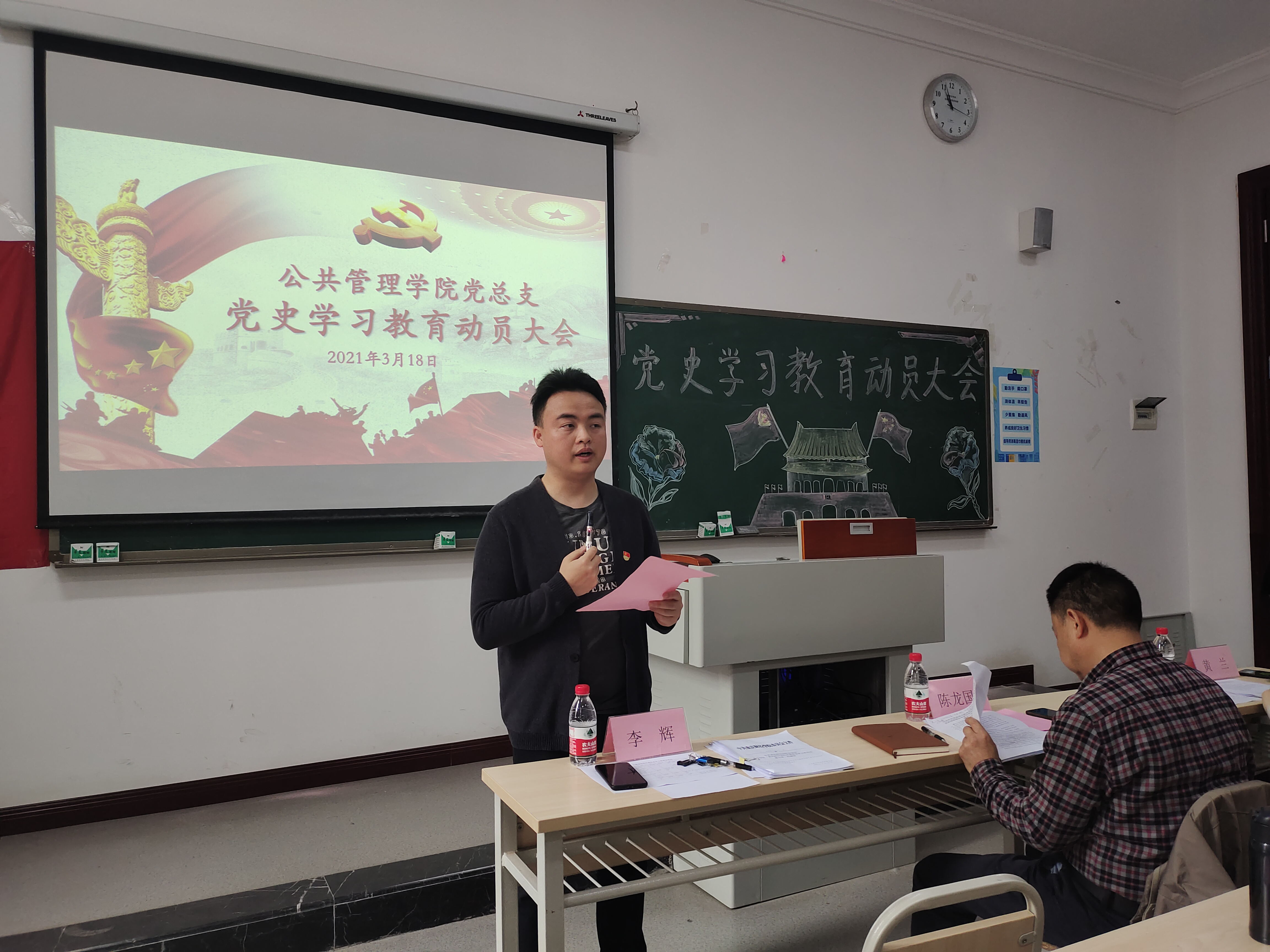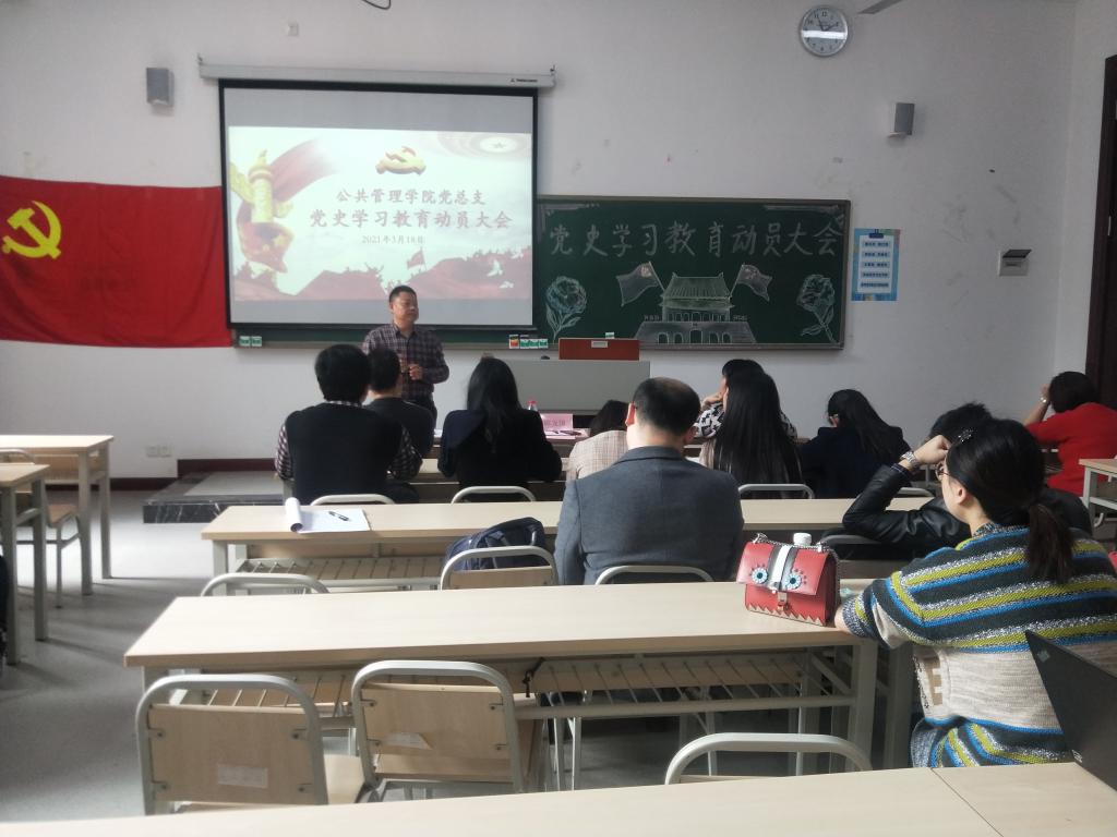 学党史,强信念,跟党走,为深入贯彻落实习近平总书记在党史学习教育动员大会上的重要讲话和深入学习党史、新中国史、改革开放史、社会主义发展史的重要指示精神,引导全院师生党员进一步坚定理想信念、传承红色基因、牢记初心使命、坚持正确方向,3月18日,公共管理学院党总支在教学楼1404教室召开党史教育动员大会暨三月党组织生活会,全体师生党员参加了此次大会。出席本次会议的有校党委陈龙国副书记、公共管理学院黄兰院长、公共管理学院党总支李辉副书记。