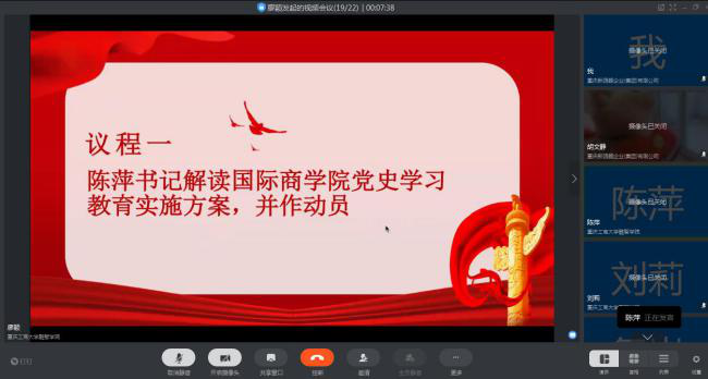 为积极响应习近平总书记让全党同志做到学史明理、学史增信、学史崇德、学史力行,以昂扬姿态奋力开启全面建设社会主义现代化国家新征程,以优异成绩迎接建党一百周年的号召,国际商学院师生联合党支部于3月22日通过钉钉开展了“学党史、悟思想、办实事、开新局”党史学习动员大会暨3月党员大会。国际商学院师生联合党支部全体师生党员参加此次会议,会议由支部组织委员廖颖主持。