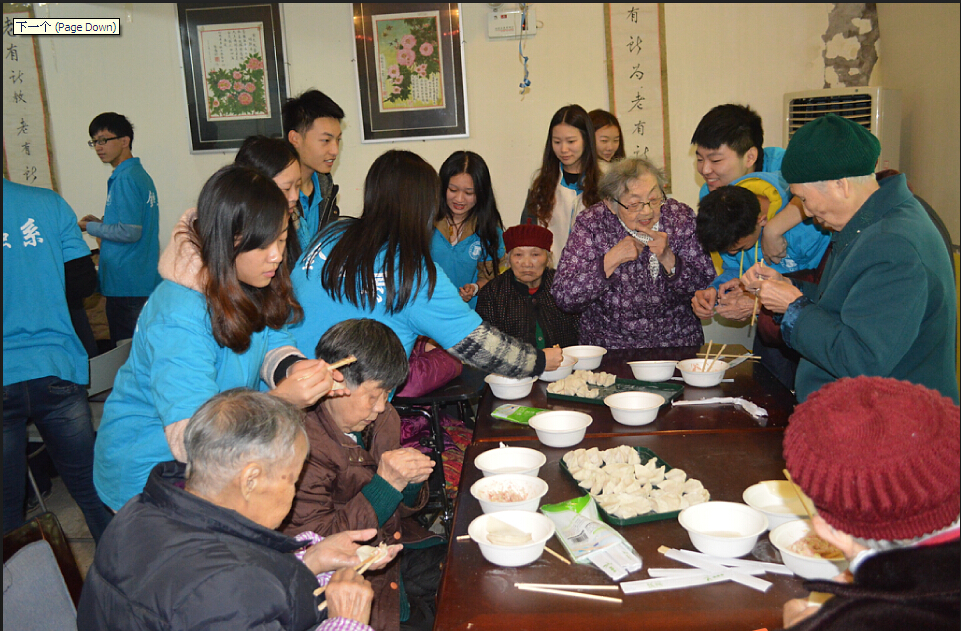 福利院里,志愿者和老人们一起包饺子,聊家常、表演节目。老人们脸上洋溢着幸福的笑容,欢声笑语充满了福利院的每一个角落,使这个冬天不再寒冷。当谈及家人儿女,老人们寂寞的神情牵动着志愿者的心弦。离别时,老人们紧紧拉着志愿者的手不愿放开,不舍之情溢于言表。当得知分别只是暂时,志愿者们不久之后将会再次回到这里,老人们才恋恋不舍得放开志愿者的手,说道:“你们都是好孩子,在学校要好好学习,天冷了,多穿衣服”。相比志愿者们的陪伴,老人们更加渴望的是来自家人和子女的关怀,愿老人们身体健康,长命百岁,同时也希望老人的子女们能够抽出时间,多多陪伴老人,让他们感受到家庭的温暖。