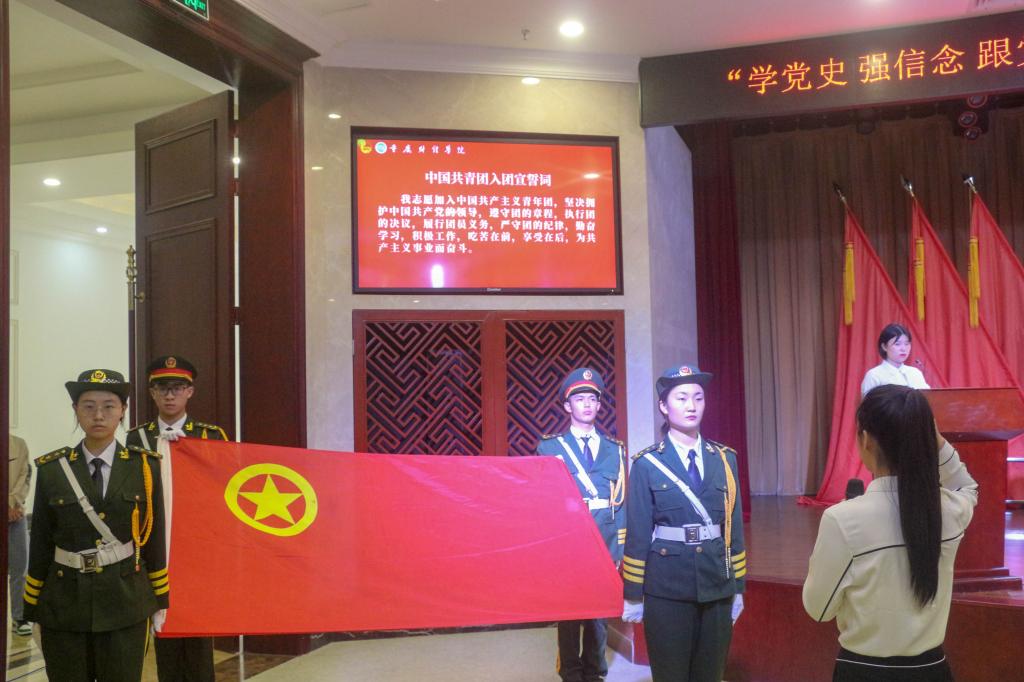 “唱支山歌给党听,我把党来比母亲……”大会在一首《唱支山歌给党听》快闪活动中拉开序幕。国旗护卫队迈着整齐的步伐徐徐前进,全体齐唱国歌后,进行了入团仪式,全体团员青年重温入团誓词,在庄严的誓词中同学们重温了入团的初心和团员的使命。