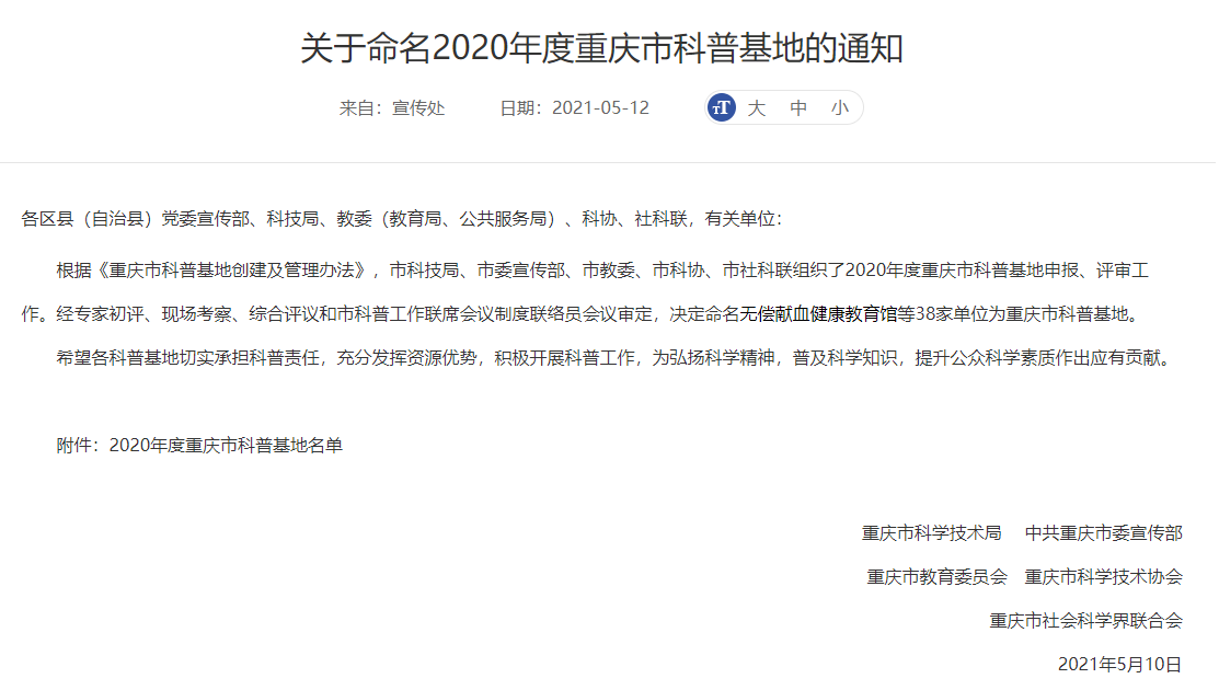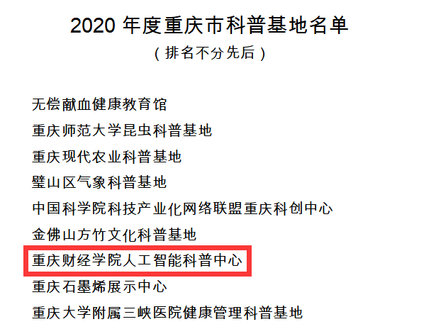 近日,重庆市科学技术局、中共重庆市委宣传部、重庆市教育委员会、重庆市科学技术协会、重庆市社会科学界联合会正式发布《关于命名2020年度重庆市科普基地的通知》,我校“靠谱的电子游戏平台官网人工智能科普中心”成功获批为重庆市科普基地,标志着我校又一省部级平台的诞生。