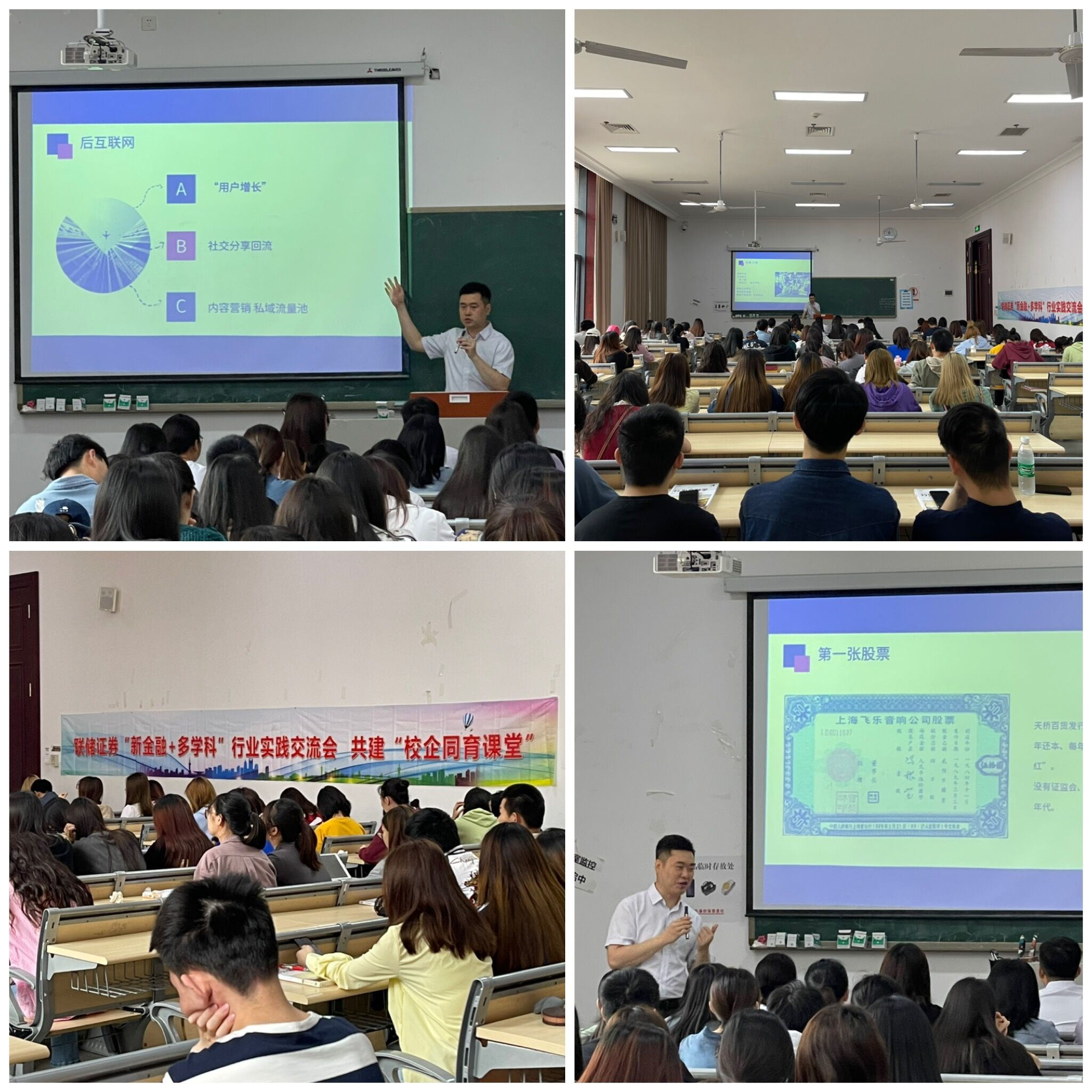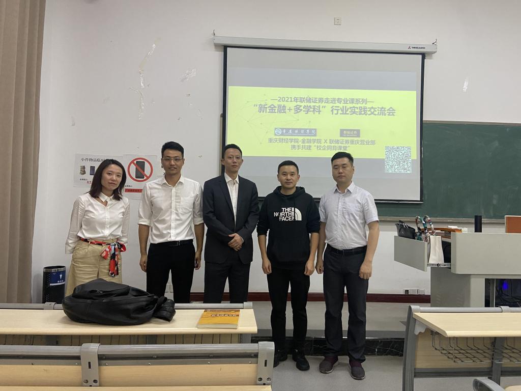为进一步强化专业内涵、创新育人模式、践行跨学科产教融合育理念, 5月25日,金融学院与联储证券有限责任公司携手举办“2021联储证券走进专业课系列活动”之“新金融+多学科”行业实践交流会联储证券重庆营业部总经理牛旭、副总经理兼市场开发部负责人魏翔、副总经理兼投资顾问部与财富管理中心负责人胡秋果、财经作家兼财商科普讲师胡瑞等作为课堂嘉宾应邀出席,与金融学院《行为金融学》专业课主讲教师郭静林一起参与专业课知识教学和行业经验分享本次交流覆盖18级金融学专业证券期货方向与银行管理方向、经济与金融专业的160多名学生
