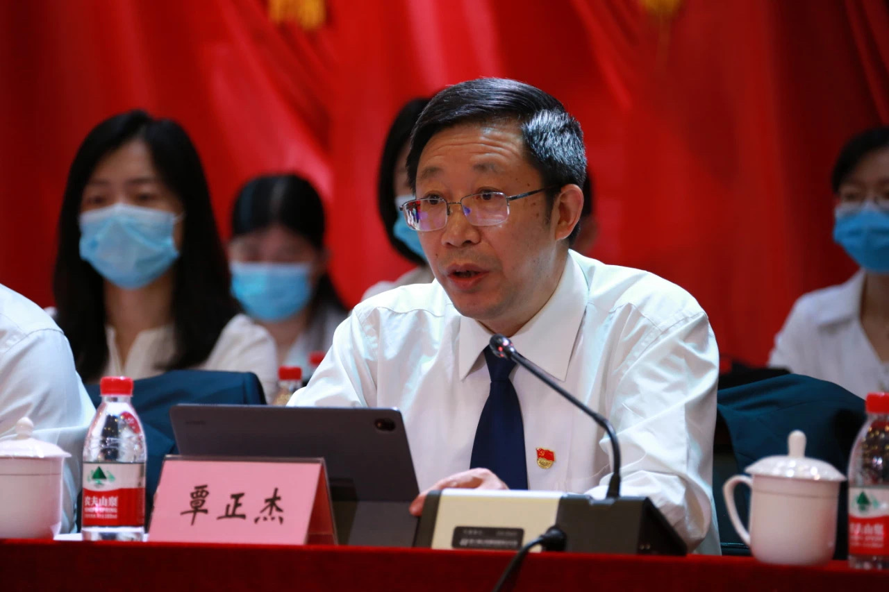 市委教育工委专职副书记覃正杰发表重要讲话。覃副书记在感谢集团副总裁、学校理事长杜积西热情洋溢的致辞后,他强调,党员大会是学校政治生活的大事,也是新时代新时期一次重要的大会。开好这次党员大会对于全面总结学校历年来所取得的成绩和经验,深入分析学校改革发展的机遇,充分发挥党委的政治核心作用,进一步明确改革发展方向和重大战略举措,推动学校“十四五”期间各项事业的发展具有十分重要的意义。在此,他提出三点意见。第一,严明纪律,规范程序,高质量高标准完成大会任务;第二,团结奋进,担当作为,推动全面从严治党;第三,科学规划,凝心聚力,奋力开创学校事业发展新局面。