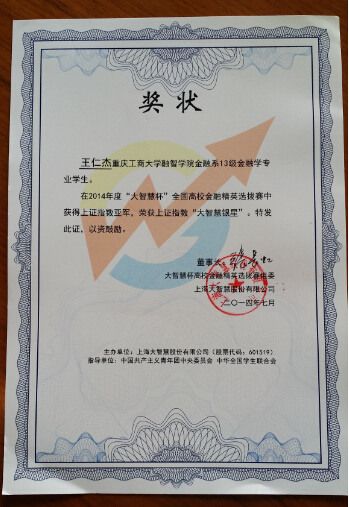 热烈祝贺我院王仁杰同学在“大智慧杯”全国高校金融精英选拔赛中喜获佳绩