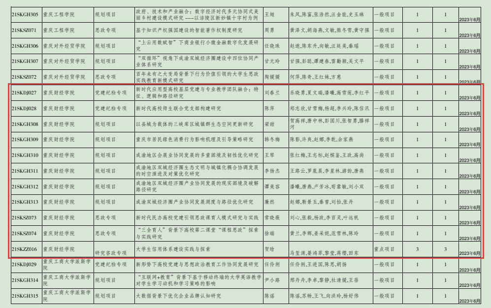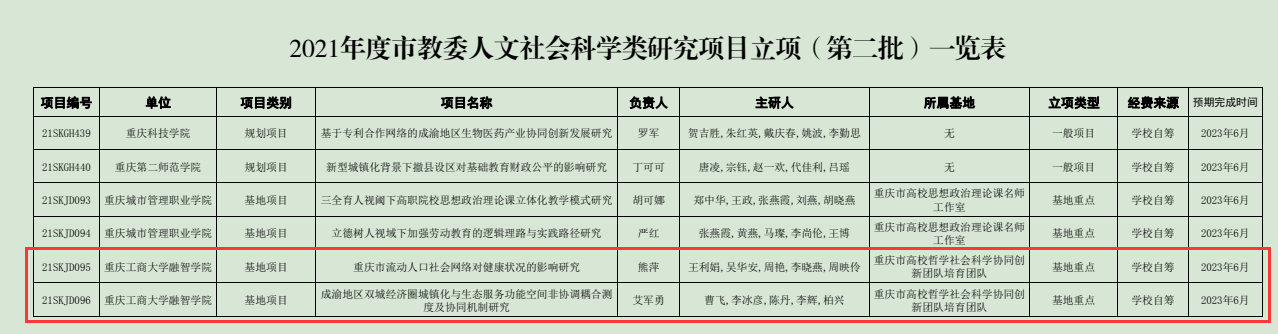 近日,重庆市教育委员会发布《关于2021年度人文社会科学类研究项目立项第二批次的通知》,我校教师本年度共获批立项13项。其中,规划项目6项、党建纪检2项、思政专项2项、咨政专项1项、基地项目2项,该类项目立项数再创新高。