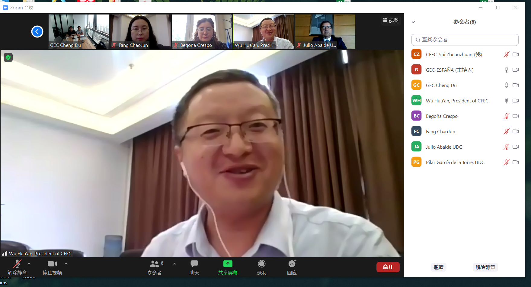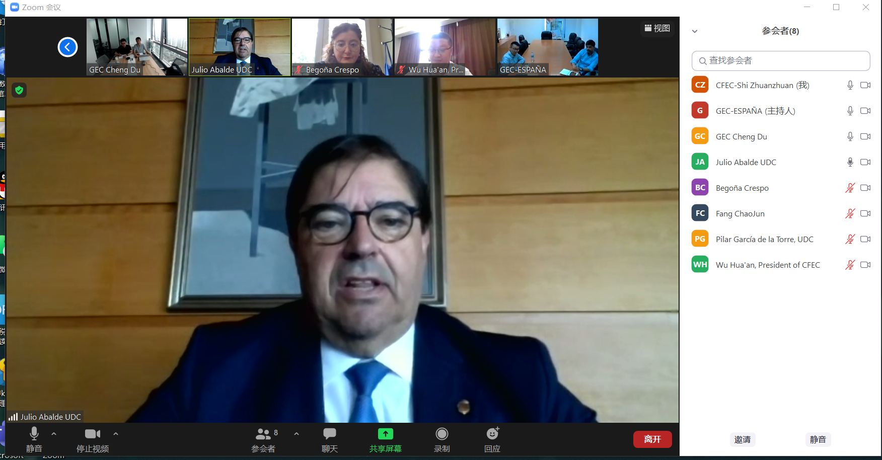 7月2日下午,我校与西班牙拉科鲁尼亚大学视频联线,洽谈合作并举行线上签约仪式。校长吴华安、校长助理房朝君及西班牙拉科鲁尼亚大学校长Julio E. Abalde Alonso、拉科鲁尼亚大学国际关系处处长Begona Crespo及拉科鲁尼亚大学国际代表Juan Carlos Izquierdo出席视频会议。会议由国际合作与交流处处长石转转主持。