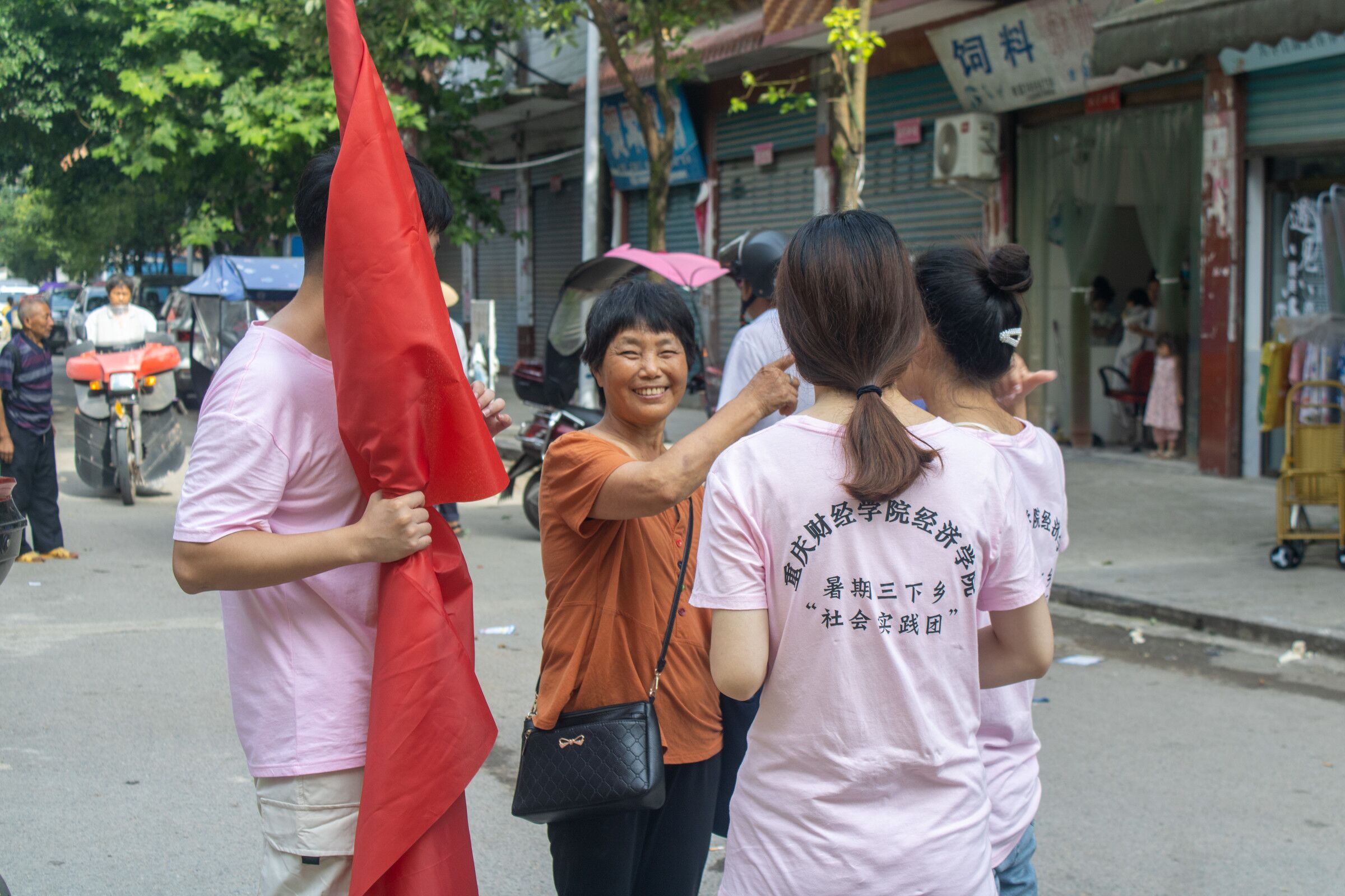实践团队第一站来到重庆市垫江县高峰镇大井村。74日恰逢高峰镇赶集的日子,队员们早早来到镇上深入群众开展党史学习调研,开展党史宣传。