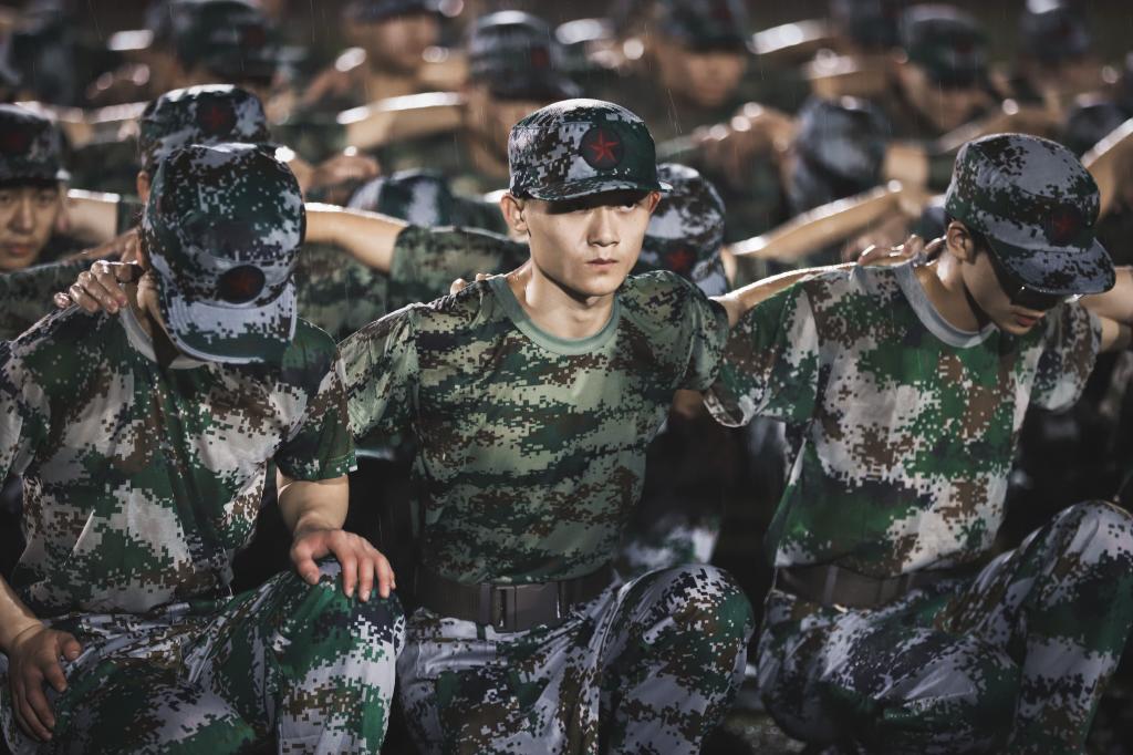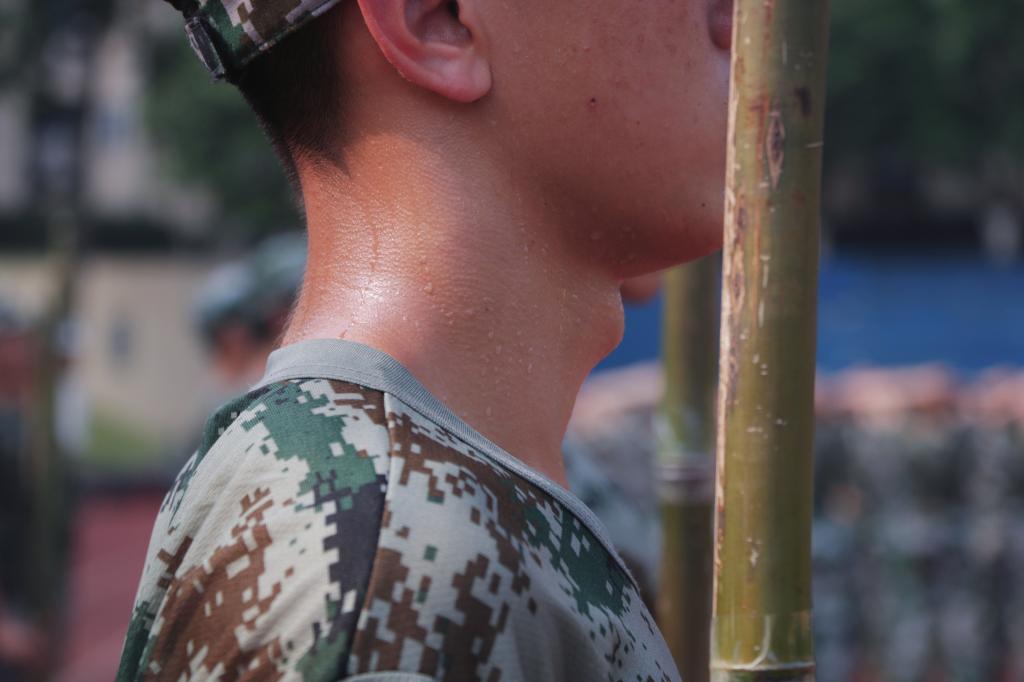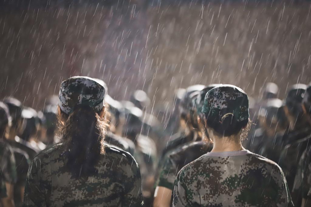墨色的浓云挤压着天空,沉沉的仿佛要坠下来,淡漠的风凌厉地穿梭着,将同学们的惊呼抛在身后。不到片刻,天空中灰色的布幔裂开了一条缝,像明晃晃的刀口在这布幔上划过。电闪雷鸣,仿佛要把大地劈开,暴雨倾盆而降,像天上的河决了口子,凶猛地往下浇。但是我们的新兵们没有丝毫的动摇,直直地、坚定地站在训练场上,大雨湿透了他们的迷彩服,呼啸而来的风又带来凉意,与他们训练时火热的皮肤相触,一水一火,不是好滋味。但他们仍然不动如钟,秉持着军人的操守,只要没有收到教官的口令,就不能脱离训练,不能脱离队伍。