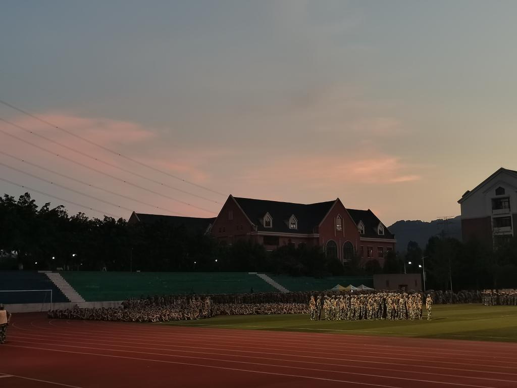 霞彩的云朵飘在蓝蓝的天空中作点缀,时而滚作一团团棉絮,时而化作长长的绫罗,像一缎轻纱,被夏风徐徐吹送,又忽然散开,飘飘上升,溶进又深又蓝的天空。霞光奔泻的云海,像是远在天边,又似近在咫尺,轻拢慢涌,铺排相接。变化多姿的云朵总是引发起无数美好的遐想,也不失为辛苦训练时让人放松的可爱趣物。在这样的好天气下,同学们积极参与训练的热情也随之高涨,步履整齐,拳脚有力,军姿飒爽,好一副少年模样!