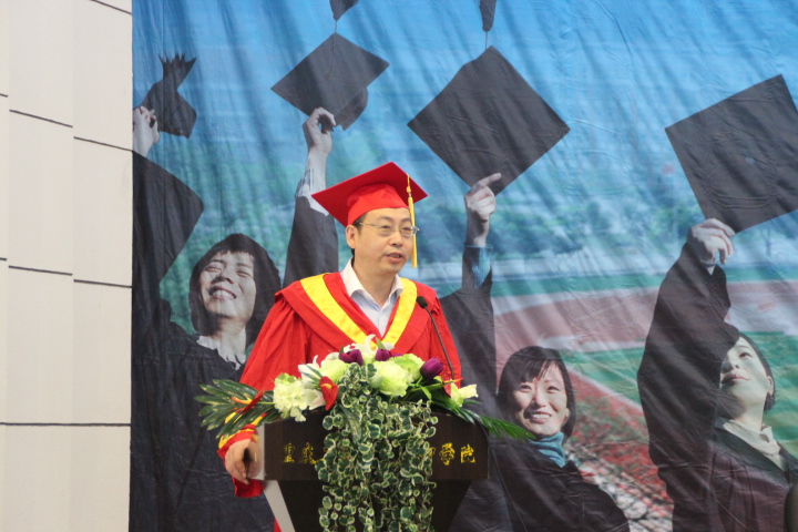 随后,刁孝华院长代表学院致辞。在致辞中,刁院长对毕业生表示感谢,感谢毕业生对学院的执着、参与、包容与付出。同时对即将离开母校的毕业生们提出三点希望:一希望同学们继续关注学院发展;二希望同学们常怀包容、宽容之心;三希望同学们做有责任、敢担当的人。最后,刁院长为毕业生送去毕业祝福,祝大家前程似锦、梦想成真,同时别忘了常回家看看。