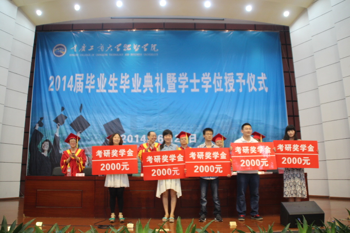学院党委书记丁广龙宣读了《重庆市教育委员会关于表彰2014年普通高等教育优秀毕业研究生和优秀大学毕业生的通报》、《关于表彰2014届优秀毕业生的决定》和《关于对温谦等30名考取硕士研究生的2014届毕业生予以奖励的决定》,学院领导分别为2014届优秀毕业生和考取硕士研究生的学生颁奖,并鼓励他们更进一步。随后,学院党委副书记陈龙国宣读《关于准予毕业的决定》和《关于授予学士学位的决定》学院领导分别为毕业生代表授位。接着,李果助理代表学院接受会计系向母校赠送的礼品。毕业生代表游登贵和教师代表杨小梅分别上台发言。