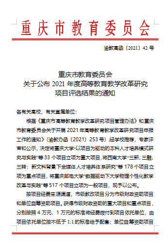 近期,重庆市教委下发了《关于公布2021年度高等教育教学改革研究项目评选结果的通知》(渝教高函〔2021〕42号),我校14项教育教学改革研究项目获市级教改项目立项,其中4个项目获批重点项目立项,10个项目获批一般项目立项,较之以往,我校2021年获批的市级高等教育教学改革项目层次有较大提高。