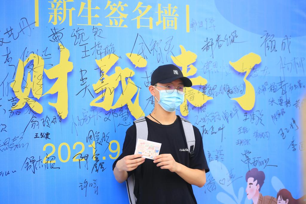 来到重财校门外,告别父母开启独立的人生旅程。消毒行李,测量体温,信息核对,手续办理,后勤保障每一步都有条不紊。人潮攒动的迎新大厅,注册身份,领取校卡,完成报到,口罩也遮不住新生们脸上灿烂的笑容,眼里激动又欣喜的光芒。别出心裁的签名板,写下你的名字,记下你的心愿,握紧通知书,定格一瞬,为你们留下在重财的最初记忆。